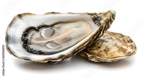 Fresh raw open oyster and closed oyster on white background. Seafood delicacy for haute cuisine and gourmet dining concept