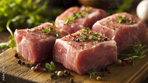 Fresh Raw Pork Chops on Wooden Cutting Board with Herbs and Spices