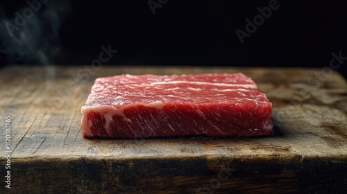 Fresh raw pork steak on a rustic wooden cutting board surrounded by a dark background for culinary and cooking themes
