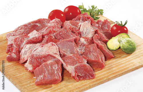 fresh raw red cubed meat chunk on wooden cut board isolated over white background