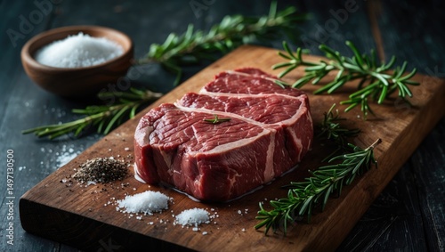 Fresh raw steak on a wooden cutting board with rosemary, salt, and pepper.
