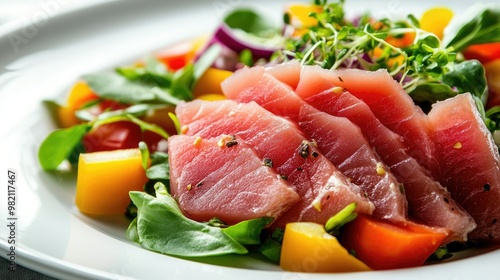 Fresh, raw tuna slices paired with a colorful vegetable salad on a white plate, creating a vibrant and healthy food presentation.