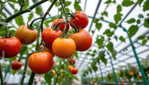 Fresh Red and Orange Tomatoes Growing in a Bright Greenhouse Environment