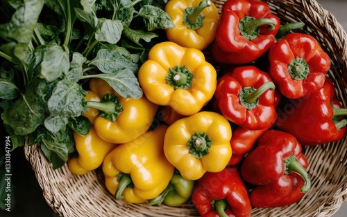Fresh Red And Yellow Bell Peppers With Leafy Greens