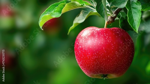 Fresh Red Apple Hanging on a Tree Branch Surrounded by Lush Green Leaves in a Vibrant Orchard Setting