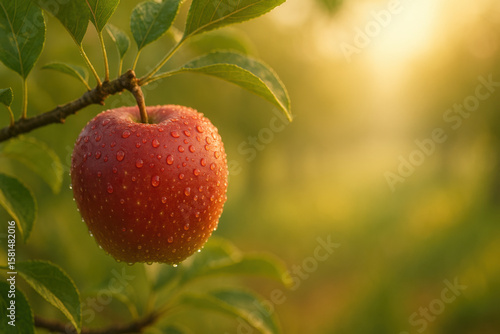 Fresh red apple hangs on branch, adorned with morning dew, surrounded by lush green leaves. soft sunlight creates warm, inviting atmosphere, enhancing beauty of this natural scene