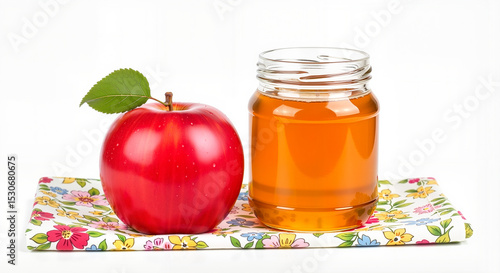 Fresh red apple next to jar of honey on floral patterned cloth