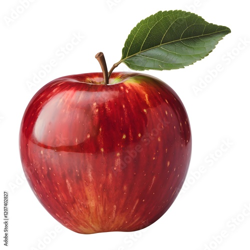 Fresh Red Apple with Green Leaf Attached to Stem.