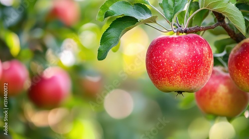 Fresh Red Apples Hanging on Tree Branch in Sunlit Orchard