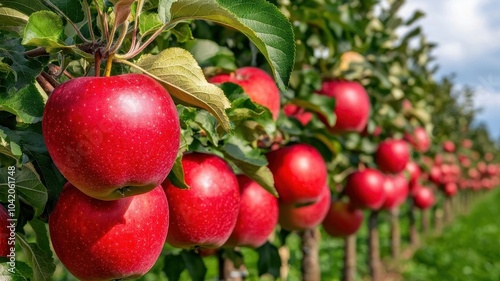Fresh red apples hanging on trees in a vibrant orchard under a blue sky.