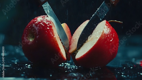 Fresh Red Apples Sliced in Half with Raindrops in Dark Setting
