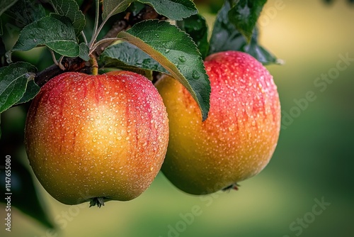 Fresh Red Apples with Dew on Tree Branch in Nature Setting