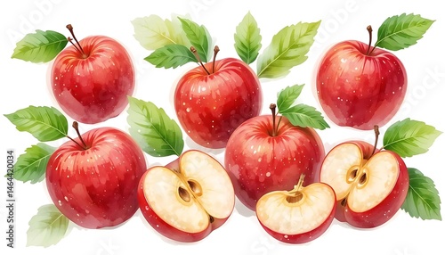 Fresh red apples with green leaves, including a sliced apple, isolated on a white background.