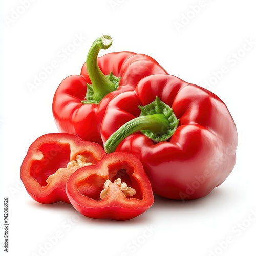 Fresh red bell peppers, whole and sliced, isolated on white background.