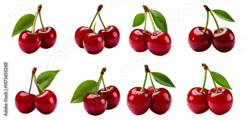 Fresh Red Cherries with Leaves, Isolated on Transparent Background, Isolated on Transparent, white background