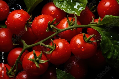 Fresh red cherry tomatoes scattered among vibrant green leaves, showcasing their glossy texture and natural shine