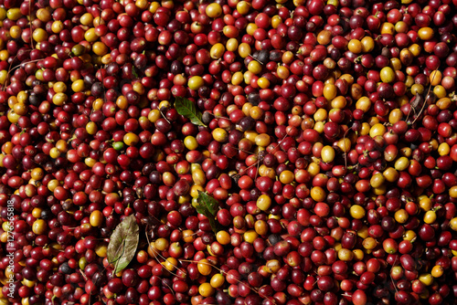 Fresh red coffee beans waiting for the production process to be dried and roasted.