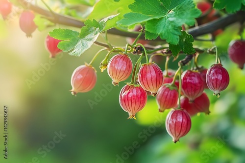 Fresh Red Gooseberries Ripening on Branch in Warm Sunlight with Green Leaves
