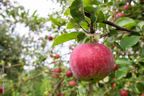 Fresh red juicy apples in organic Eco-friendly garden. Close up apple on a branch on a tree. Branch with red apple in orchard.