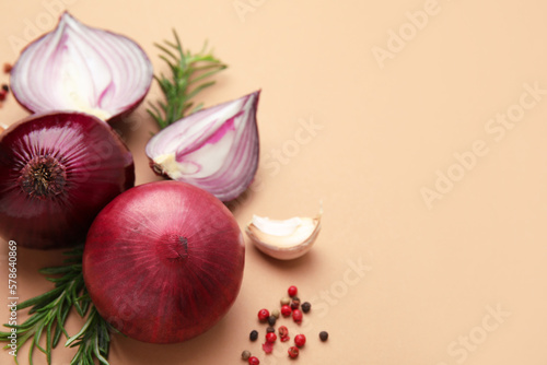 Fresh red onions, garlic, rosemary and spices on beige background, flat lay. Space for text