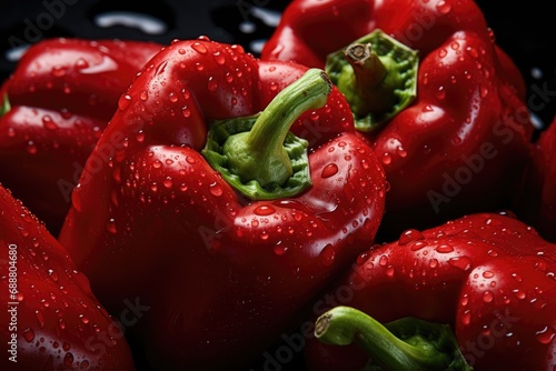 Fresh red pepper seamless background, adorned with glistening droplets of water. Top down view.