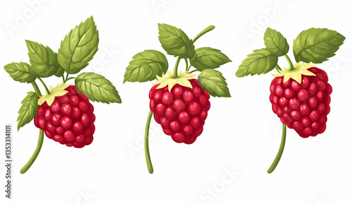 Fresh Red Raspberries with Green Leaves Isolated on White Background