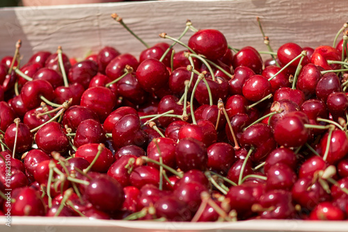 Fresh red sweet cherries in wooden crates prepared for sale on a market.
