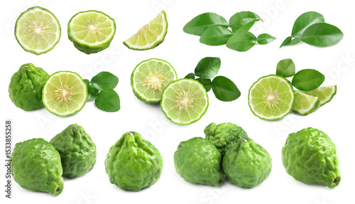 Fresh ripe bergamot fruits and green leaves on white background, collage