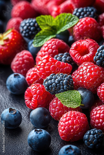 Fresh ripe berries including strawberries, raspberries, blueberries, and blackberries are beautifully arranged, showcasing their vibrant colors and textures. image evokes sense of freshness