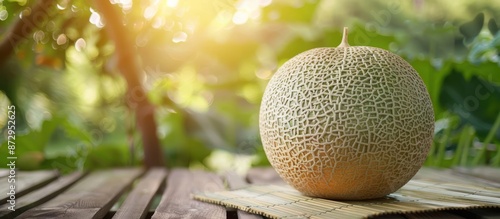 Fresh ripe cantaloupe melon on wooden table in the garden. Concept of healthy eating, summer fruit, and agriculture.