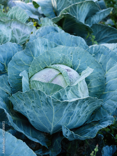 Fresh ripe head of green cabbage (Brassica oleracea) with lots of leaves growing in homemade garden, short before the harvest. Organic farming, healthy food, BIO viands, back to nature concept.