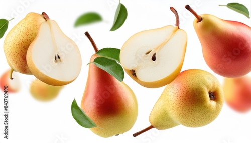 Fresh ripe Pear falling in the air, isolated on white background. Food levitation or zero gravity concept. High resolution image