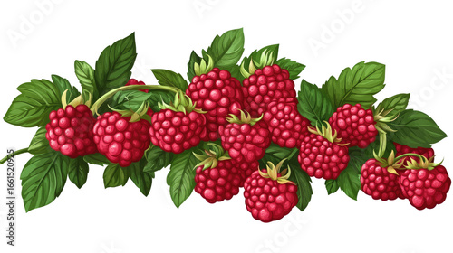 Fresh Ripe Raspberry with Green Leaves Isolated on White Background