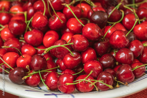 Fresh ripe red cherry or cherries fruit in a wooden box in a farmer agricultural open air market, seasonal healthy food. Concept of biological, bio products, bio ecology
