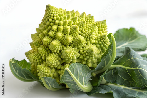 Fresh Romanesco Cauliflower with Leaves on White Background