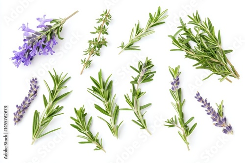 Fresh rosemary and lavender herbs aromatic plants culinary bouquet food green thyme scent white