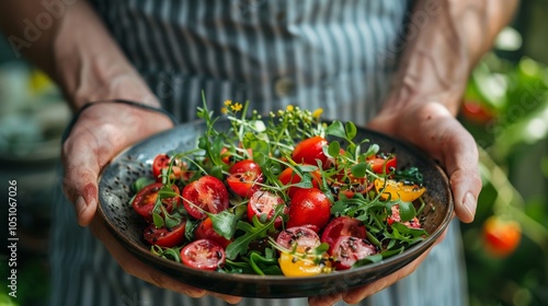 Fresh Salad with Cherry Tomatoes Greens and Herbs in Hands