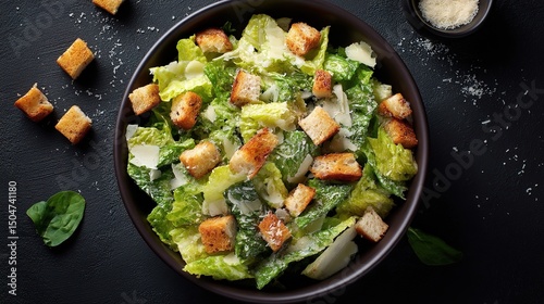 Fresh Salad with Crispy Croutons in a Bowl from Top View