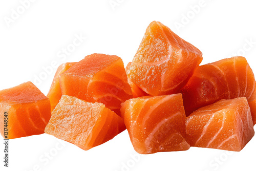 Fresh salmon cubes are displayed in vibrant orange color, showcasing their rich texture and quality. Perfect for sushi or sashimi, these cubes highlight freshness of seafood