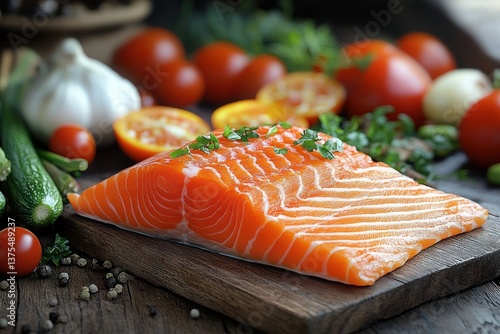 Fresh salmon fillet on wooden table with garlic lemon and vibrant vegetables