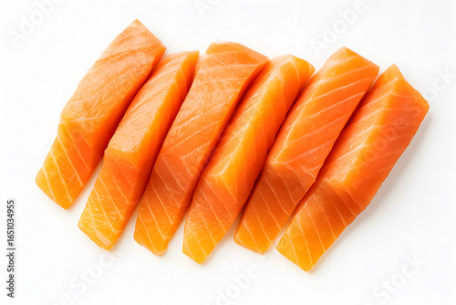 Fresh salmon fillets arranged on a white surface showcasing their vibrant color and texture, healthy seafood perfect for gourmet meals