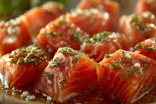 Fresh salmon pieces seasoned with herbs and salt on a rustic plate ready for preparation in a kitchen setting
