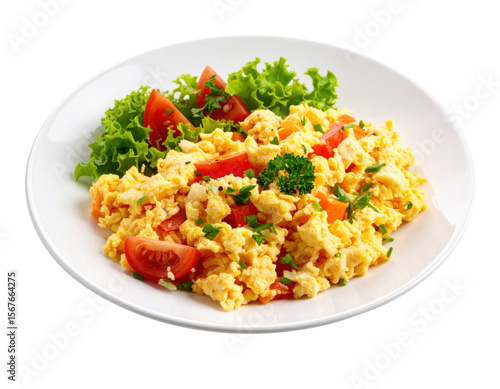 Fresh scrambled eggs with tomatoes and herbs served on white plate with salad garnish on transparent background
