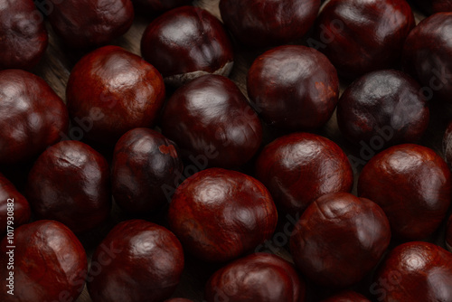 Fresh shiny chestnuts on a wooden table. Close up.