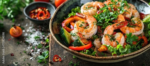 Fresh shrimp on white plate and fresh vegetables cooked shrimps prawns and seafood spicy chili sauce coriander cooking shrimp salad lemon lime. Creative Banner. Copyspace image