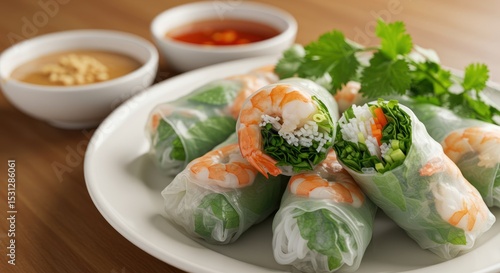 Fresh shrimp spring rolls served with peanut and chili sauces.