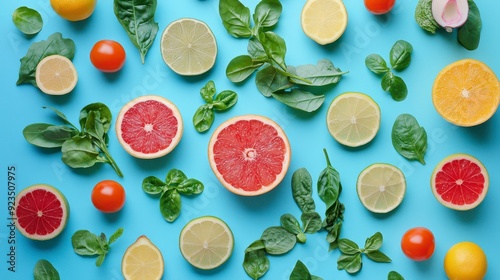 Fresh sliced citrus fruits and spinach leaves arranged on blue background