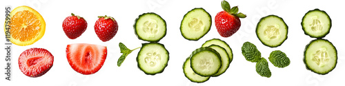 Fresh Sliced Strawberries, Cucumbers, Orange & Mint on White Background