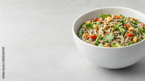 Fresh soba noodles with vegetables and nuts in white bowl, garnished with sesame seeds. healthy and vibrant meal option