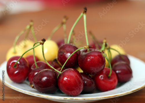 Fresh sour cherries in a wihte plate and green leaves on the board. Fresh ripe sour cherries.